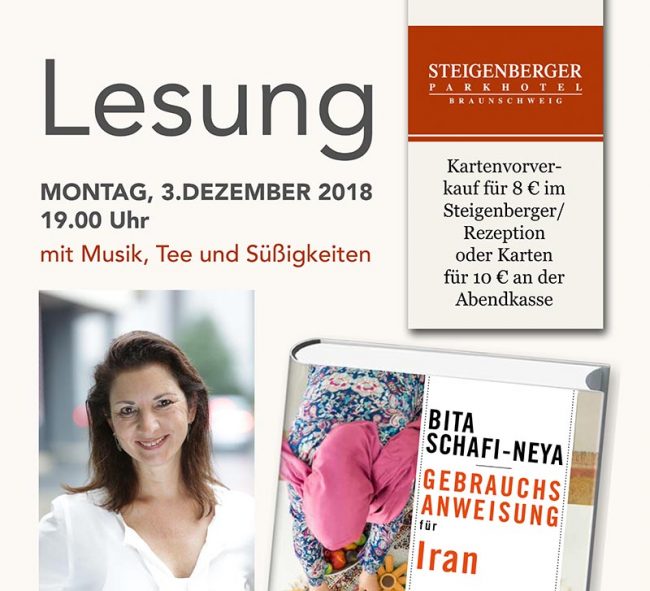 Lesung mit Musik, Tee und iranischen Süßigkeiten am 3. Dezember um 19.Uhr im Steigenberger Parkhotel, Braunschweig Kartenvorverkauf Steigenberger Parkhotel, Rezeption 8 Euro. Abendkasse 10 Euro